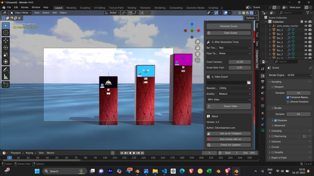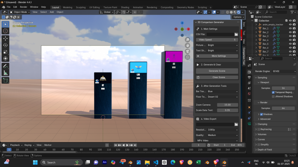 Create stunning 3D bar chart comparison videos right inside Blender! This addon automates the entire process, from reading your data in a CSV file to setting up a beautiful, animated scene ready for rendering.